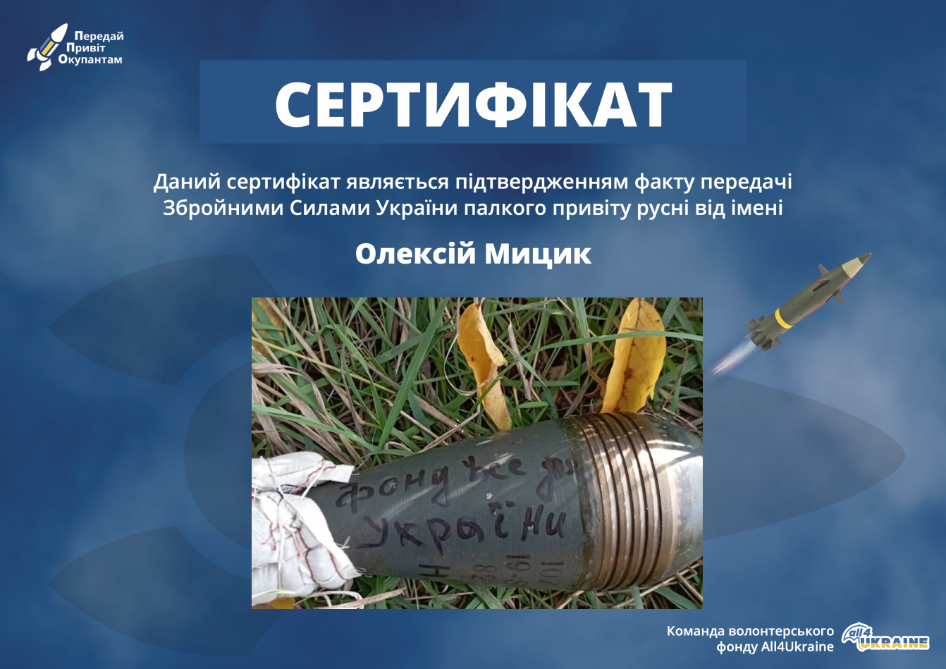 Після запуску снаряду з Вашим посланням ми відправимо Вам на пошту фото з підписаним снарядом, а також підготуємо для Вас сертифікат наступного зразка: